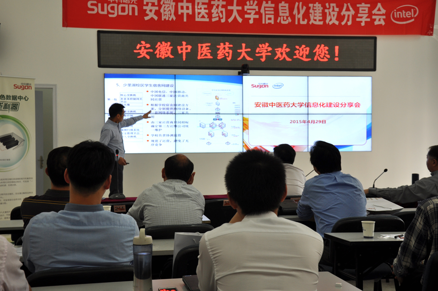 会上,蒋宏杰主任从校园网综合布线、IDC中心机房、安防监控系统、校园一卡通系统、网络化多媒体教学系统、录播室及演播室等方面介绍了我校信息化建设情况。中科曙光结合我校整体机房及服务器虚拟化解决方案与各位来宾进行了交流探讨。