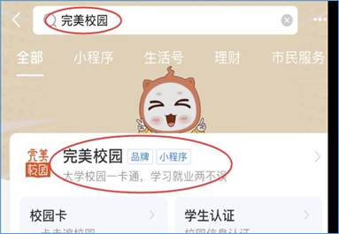 打开支付宝APP,在最上面搜索【完美校园】,点击【完美校园】品牌。