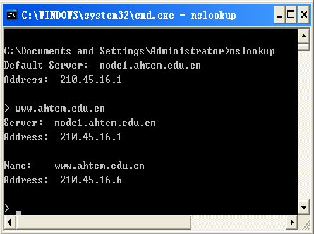 键入nslookup后第一行显示的是本机所使用的域名服务器;第二行是其IP地址。