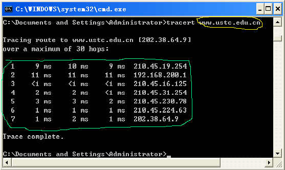 上图中TRACERT后面黄色圈中为要查询的目的地址(域名或IP地址),绿线框中是到达的跳数(即网关设备数)。